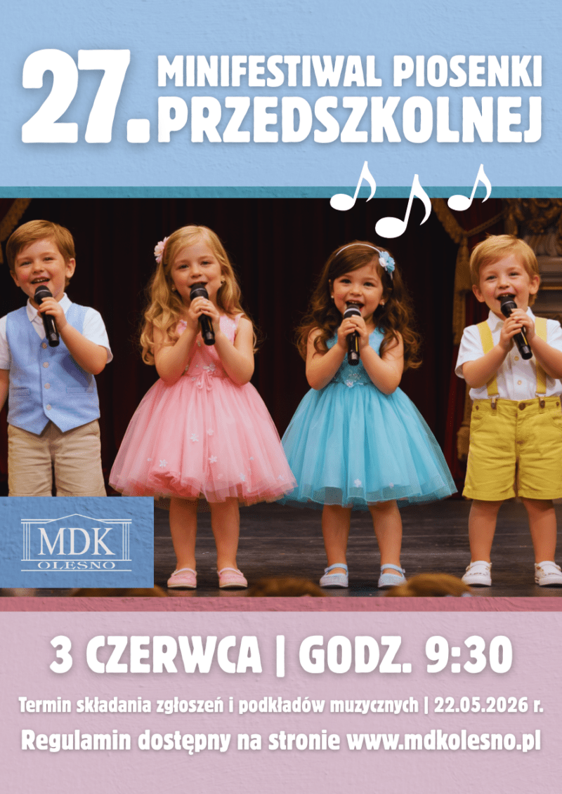 W Miejskim Domu Kultury w Oleśnie już 3 czerwca zostanie zorganizowany 27. Mini Festiwal Piosenki Przedszkolnej. Celem festiwalu jest popularyzacja piosenki przedszkolnej, wyzwalanie u dzieci radości ze śpiewania oraz oczywiście dobra zabawa. Udział w konkursie mogą wziąć dzieci w wieku od 4 do 7 lat.