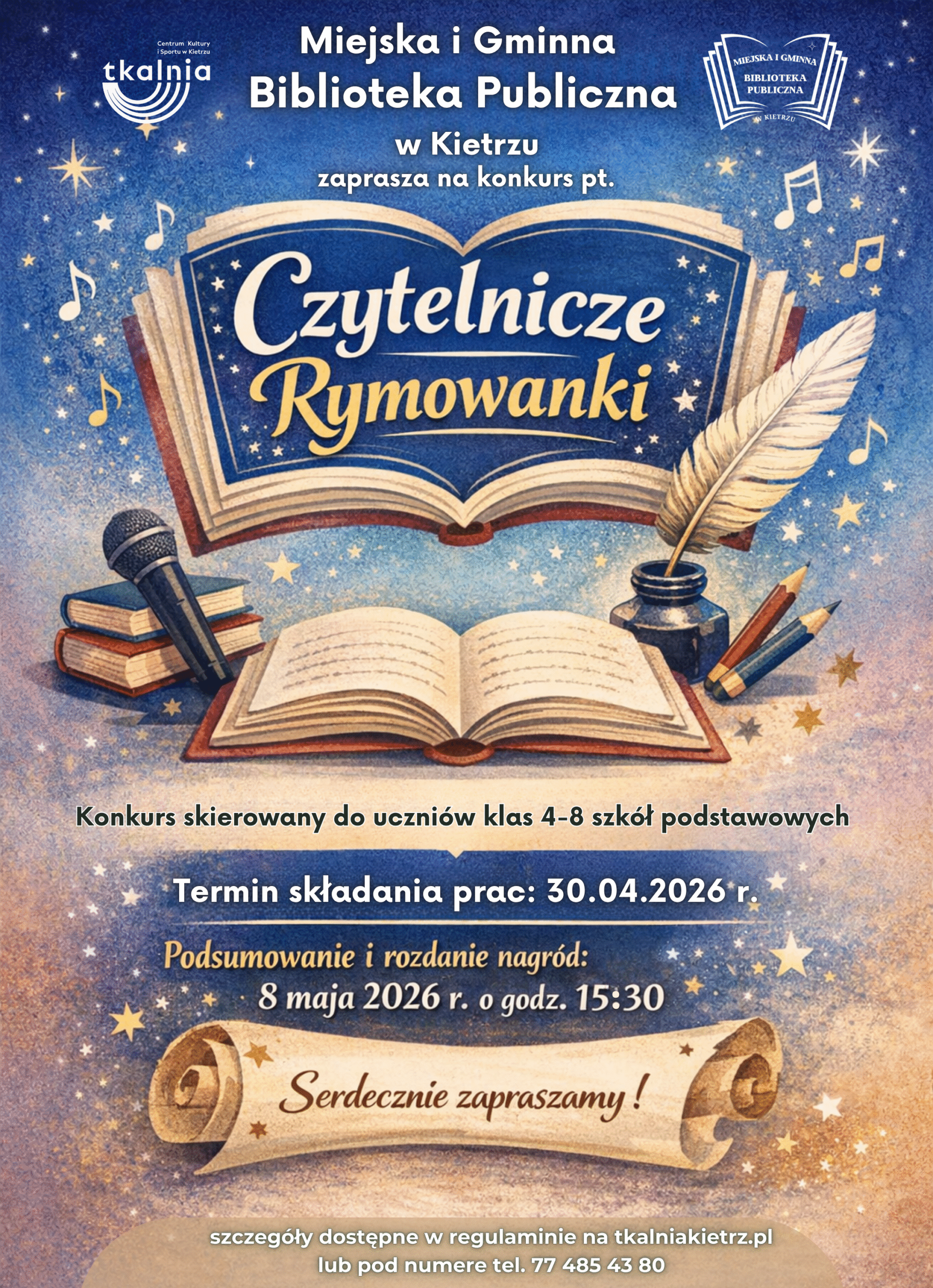 Miejska i Gminna Biblioteka Publiczna w Kietrzu zaprasza uczniów szkół podstawowych do udziału w konkursie skierowanym do młodych miłośników słowa. Inicjatywa ma na celu rozwijanie kreatywności, wyobraźni oraz promocję czytelnictwa wśród dzieci i młodzieży z terenu gminy Kietrz.