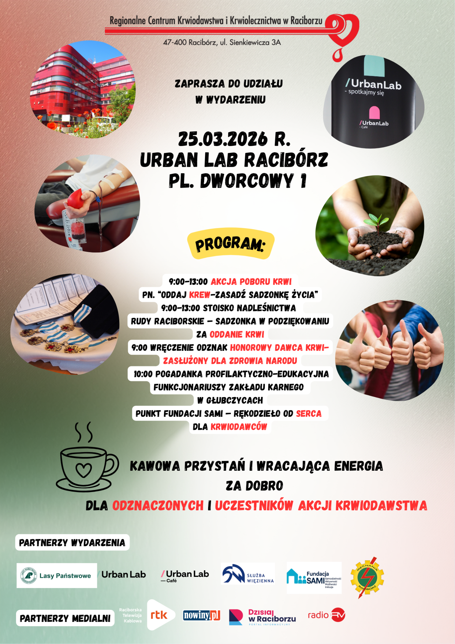 „Oddaj krew i zasadź sadzonkę życia” – to tytuł wyjątkowego spotkania, które już jutro(25.03) zostanie zorganizowane przez Regionalne Centrum Krwiodawstwa i Krwiolecznictwa w Raciborzu w przestrzeni Urban Lab. Podczas wydarzenia przewidziano szereg atrakcji i oficjalnych uroczystości. W szczególności odznaczeni zostaną honorowi dawcy krwi, którzy przez lata swojego zaangażowania i bezinteresownej pomocy zasłużyli na szczególne wyróżnienie. Roksana Pytlik, dyrektor placówki, podkreśla, że to nie tylko moment docenienia krwiodawców, ale także okazja do wspólnego działania dla dobra lokalnej społeczności.