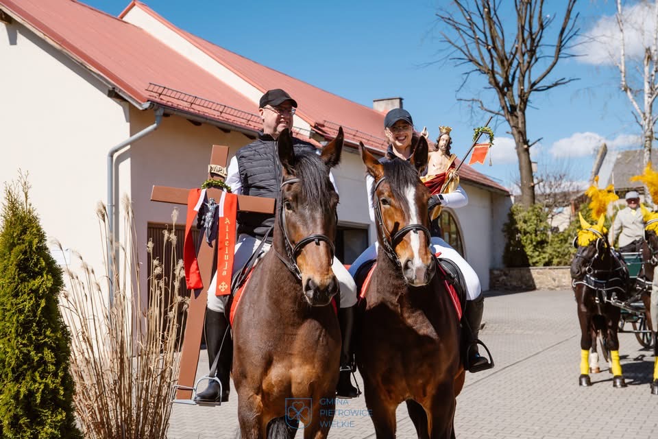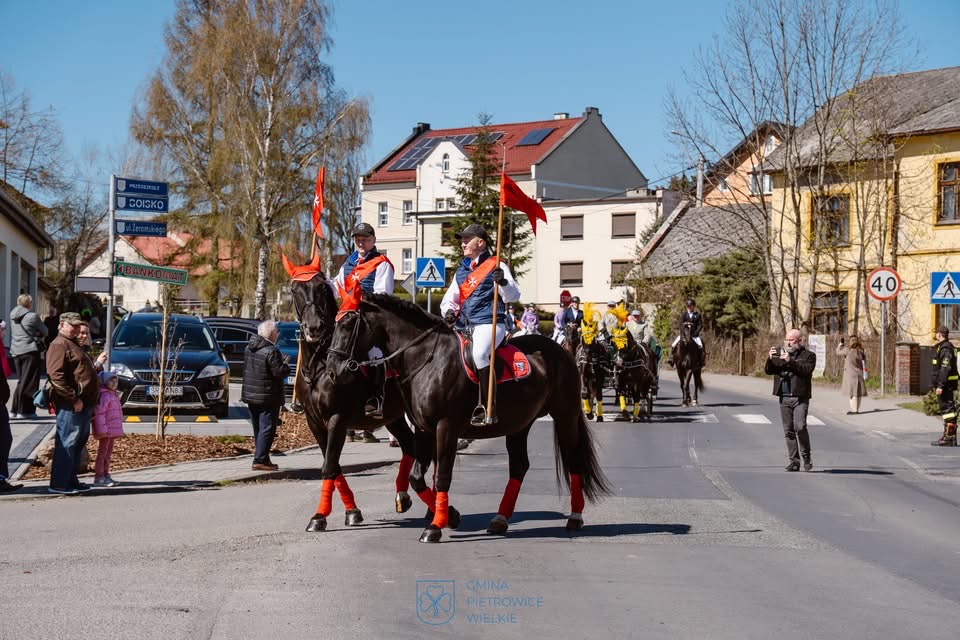Poniedziałek Wielkanocny przeszedł do historii w Pietrowicach Wielkich jako dzień pełen tradycji, radości i wspólnoty. Blisko 100 koni wzięło udział w tradycyjnej Procesji Konnej, która od lat stanowi jedno z najważniejszych wydarzeń w regionie. Kolorowy orszak, radosne pieśni, powiewające flagi oraz wyjątkowa, świąteczna atmosfera towarzyszyły uczestnikom na każdym etapie tej niezwykłej uroczystości. Mieszkańcy licznie zgromadzili się wzdłuż trasy, by podziwiać pięknie przystrojone konie i jeźdźców w odświętnych strojach, a także wspólnie przeżywać ten wyjątkowy czas.