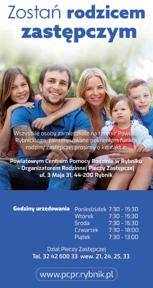 Powiatowe Centrum Pomocy Rodzinie w Rybniku zachęca do podjęcia niezwykle ważnej i odpowiedzialnej roli, jaką jest zostanie rodziną zastępczą. To szansa, by realnie zmienić życie dziecka, które z różnych powodów nie może wychowywać się w swojej rodzinie biologicznej, dając mu bezpieczeństwo, wsparcie i poczucie bliskości.
