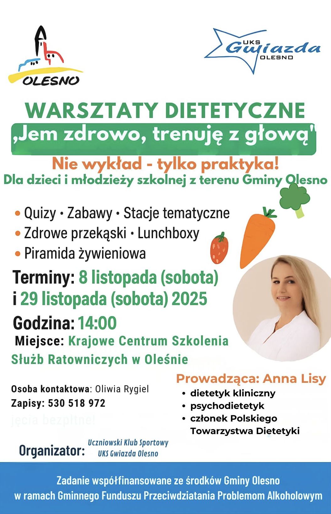 W programie warsztatów nie zabraknie różnorodnych atrakcji: quizy, zabawy, stacje tematyczne, zdrowe przekąski, lunchboxy, a także szersze omówienie piramidy żywieniowej. Jak tłumaczą organizatorzy – To nie wykład, a praktyka. Warsztaty poprowadzi Anna Lisy, dietetyk kliniczny, psychodietetyk a także członek Polskiego Towarzystwa Dietetyki. Organizatorem jest Uczniowski Klub Sportowy UKS Gwiazda Olesno. Zadanie współfinansowane jest ze środków Gminy Olesno w ramach Gminnego Funduszu Przeciwdziałania Problemom Alkoholowym.