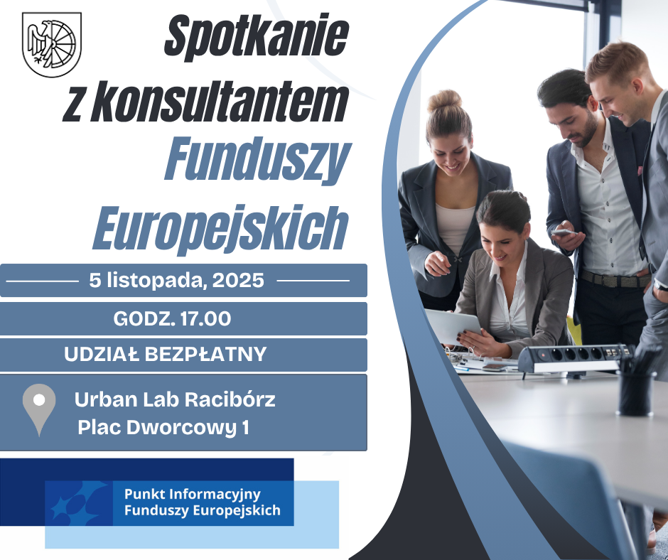 Z myślą o przedsiębiorcach zainteresowanych pozyskaniem wsparcia z Funduszy Europejskich zaplanowano spotkanie informacyjno-konsultacyjne z konsultantem funduszy europejskich. Spotkanie przewidziano na 5 listopada o godzinie 17 w Urban Lab w Raciborzu przy Placu Dworcowym 1.