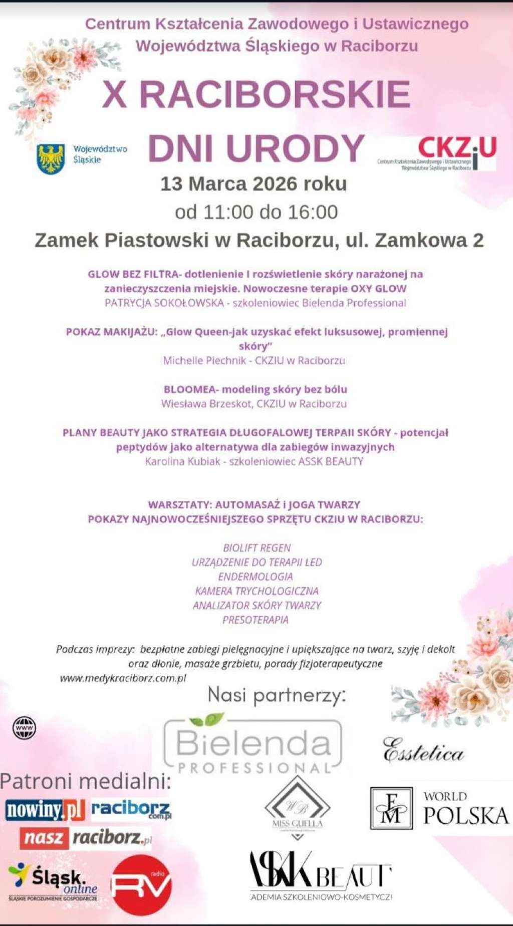 W piątek 13 marca 2026 roku w Racibórz odbędzie się jubileuszowa, dziesiąta edycja wydarzenia poświęconego kosmetologii i pielęgnacji – X Raciborskie Dni Urody. Spotkanie organizuje Centrum Kształcenia Zawodowego i Ustawicznego Województwa Śląskiego w Raciborzu. Wydarzenie potrwa od godziny 11:00 do 16:00 w wyjątkowej przestrzeni Zamek Piastowski w Raciborzu przy ulicy Zamkowej